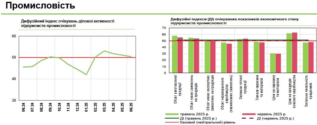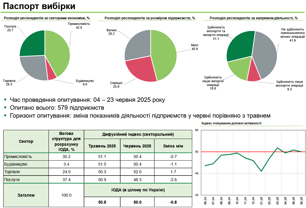 Про це свідчить індекс очікувань ділової активності (ІОДА), який Національний банк розраховує щомісяця, за винятком вимушеної перерви в березні - травні 2022 року. У червні 2025 року ІОДА становив 50.0 порівняно з 50.8 у травні 2025 року та був значно вищий за рівень у червні 2024 року (43.6).