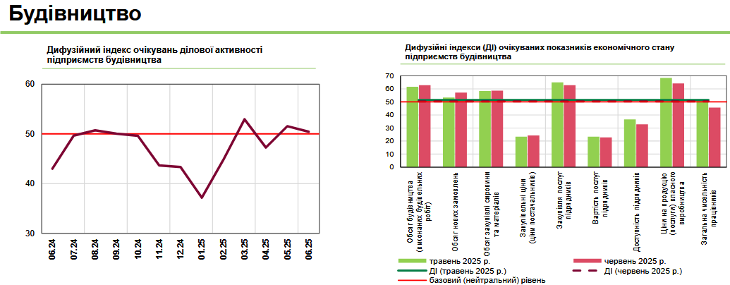 Підприємства будівництва також оптимістично оцінили свої поточні економічні результати завдяки сталому внутрішньому попиту та сприятливим погоднім умовам: секторальний індекс у червні становив 50.4 порівняно з 51.5 у травні 2025 року (у червні 2024 року - 43.0). Будівельники посилили очікування щодо збільшення обсягу будівництва, нових замовлень, закупівлі сировини та матеріалів. На тлі очікуваного сповільнення темпів зростання вартості послуг підрядників респонденти очікували на повільніше зростання обсягу закупівлі їхніх послуг та дещо послабили оцінки щодо їх доступності.