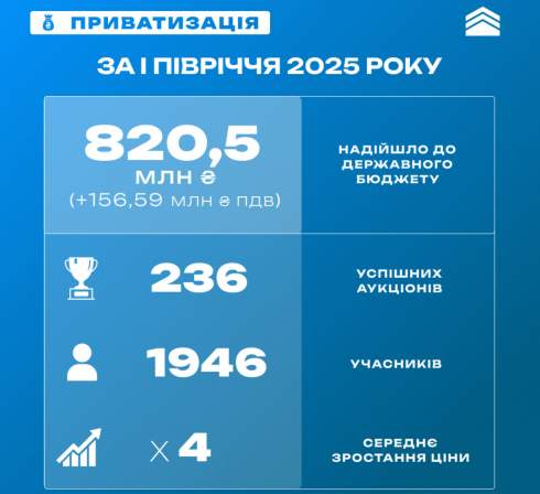 «За результатами першого півріччя 2025 року від приватизації до державного бюджету вже надійшло 820,5 млн гривень (+156,59 млн гривень ПДВ), таким чином сукупний економічний ефект становив понад 977 млн гривень», - йдеться в повідомленні.