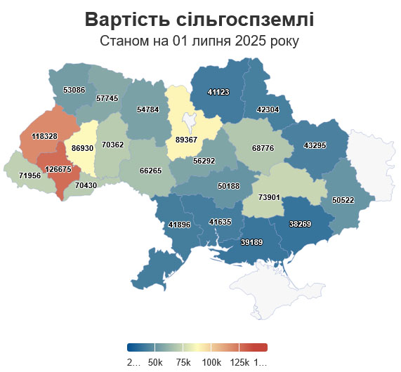 За даними експертів, найнижчі ціни на землю у прифронтових регіонах: Запорізька область - 38,3 тис. грн/га, Херсонщина - 39,1 тис. грн/га, Чернігівщина - 41,1 тис. грн/га, Миколаївщина - 41,6 тис. грн/га та Одещина - 41,8 тис. грн/га.