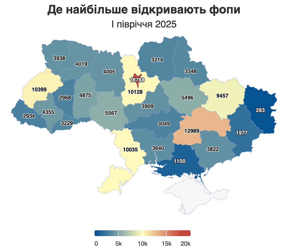 Столиця лідирує одночасно за створенням та ліквідацією бізнесів: за півріччя в Києві відкрито 18,8 тисяч нових ФОП і закрито 20,6 тисяч. Харківщина та Дніпропетровщина ділять друге місце за кількістю ліквідацій (по 13,6 тисяч).