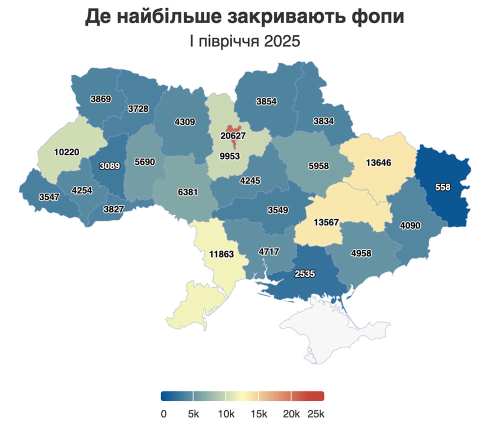 У квітні-червні хвиля дещо вщухла: у другому кварталі бізнес закрили 51,83 тис. підприємців (на 27% менше, ніж роком раніше), однак загальна негативна динаміка збереглася.