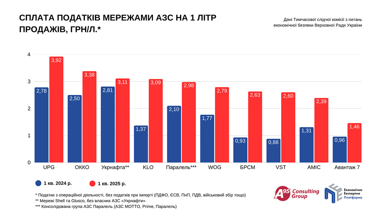 Усі без винятку 45 найбільших мереж АЗС України у І кварталі 2025 року збільшили обсяг податкових виплат у розрахунку на 1 л реалізованого пального. Якщо ще минулого року 2 грн/л вважали «непоганим» показником, то нині нормою поступово стає понад 3 грн/л.