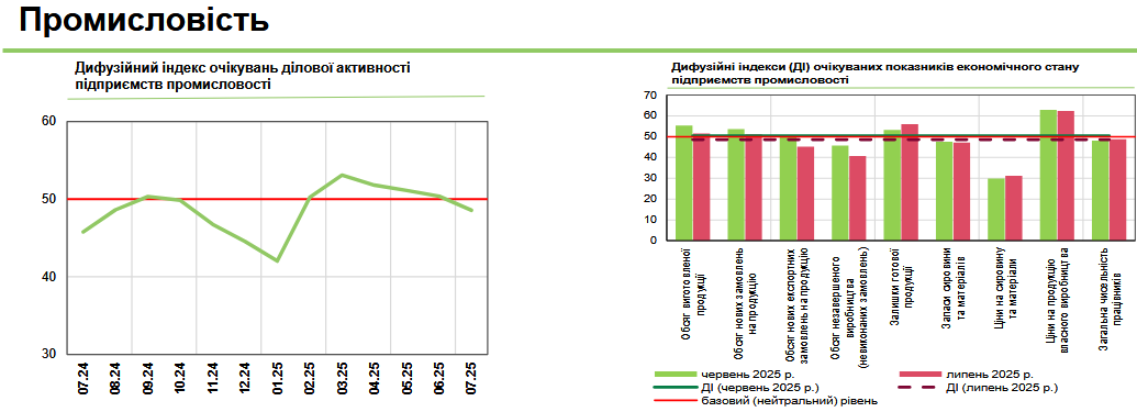Підприємства промисловості після п'яти місяців позитивних очікувань стримано оцінили результати своєї діяльності з огляду на високі безпекові ризики та здорожчання виробничих витрат: секторальний індекс у липні становив 48.6 порівняно з 50.4 у червні 2025 року (у липні 2024 року - 45.8). Посилилися песимістичні оцінки щодо обсягу нових експортних замовлень на продукцію, обсягу