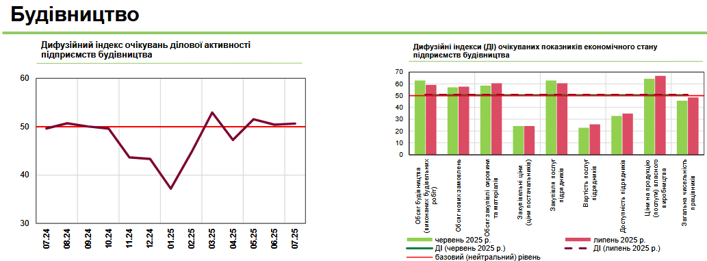 Підприємства будівництва третій місяць поспіль оптимістично оцінили свої поточні економічні результати завдяки сталому внутрішньому попиту та сезонному чиннику: секторальний індекс у липні становив 50.6 порівняно з 50.4 у червні 2025 року (у червні 2024 року - 49.6). Будівельники посилили очікування щодо збільшення закупівлі сировини та матеріалів та зберегли оптимістичні оцінки щодо обсягів будівництва та нових замовлень. На тлі очікуваного сповільнення темпів зростання вартості послуг підрядників респонденти дещо пом'якшили негативні оцінки щодо їх доступності. Водночас будівельники були налаштовані на повільніше зростання обсягу закупівлі їхніх послуг.
