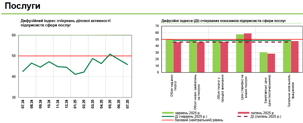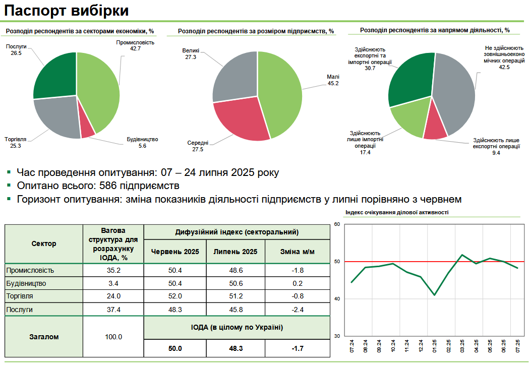 Про це свідчить індекс очікувань ділової активності (ІОДА), який Національний банк розраховує щомісяця, за винятком вимушеної перерви в березні - травні 2022 року. У липні 2025 року ІОДА становив 48.3 порівняно з 50.0 у червні 2025 року, але був вищий за рівень у липні 2024 року (44.4).
