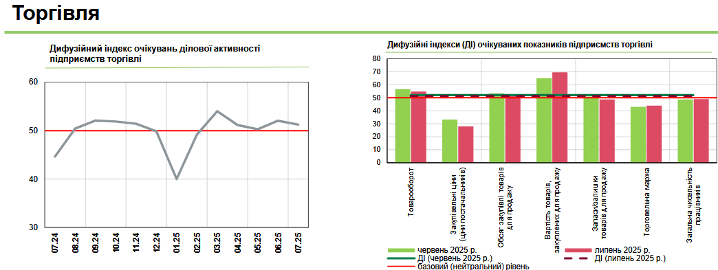 Підприємства торгівлі були, як і в червні, найоптимістичнішими, п'ятий місяць поспіль демонструючи позитивні оцінки результатів своєї поточної діяльності завдяки достатній пропозиції товарів та жвавим споживчим настроям: секторальний індекс у липні становив 51.2 порівняно з 52.0 у червні 2025 року (у липні 2024 року - 44.7). Торговельні компанії продовжили очікувати на збільшення обсягу товарообороту та обсягу закупівлі товарів для продажу, а також оптимістичніше оцінили запаси / залишки товарів для продажу. Респонденти, як і раніше, очікували на зниження торговельної маржі.