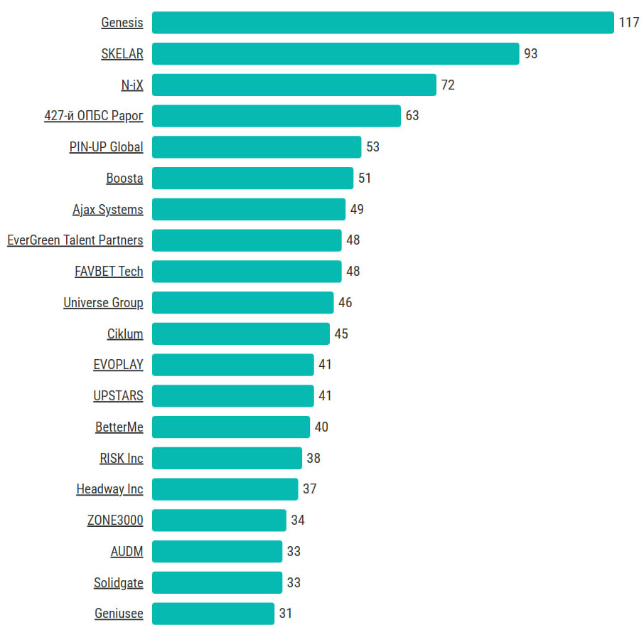 Серед компаній-лідерів за кількістю вакансій - Genesis (117), SKELAR (93) та N-iX (72). Також у топі - 427 окремий полк безпілотних систем Рарог, який розмістив 63 вакансії.