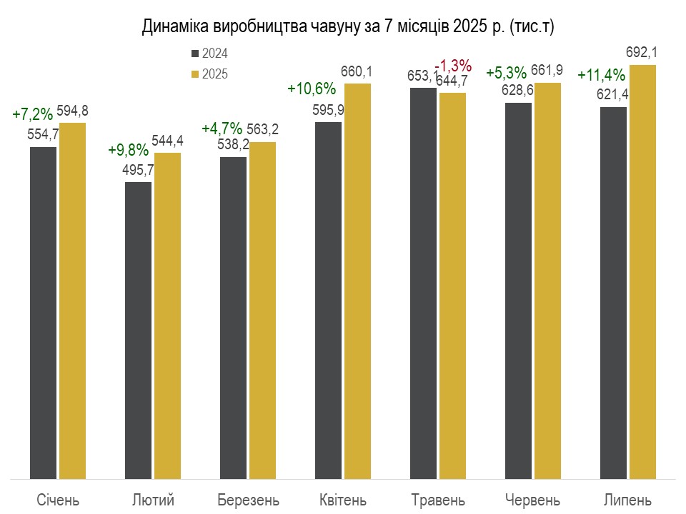 За сім місяців 2025 року виробництво чавуну в Україні зросло на 6,7% порівняно з аналогічним періодом минулого року і становило 4,36 млн т. У липні обсяги виробленого чавуну перевищили показник червня на 4,5% і сягнули 692,1 тис. т, що стало найкращим показником з початку року.