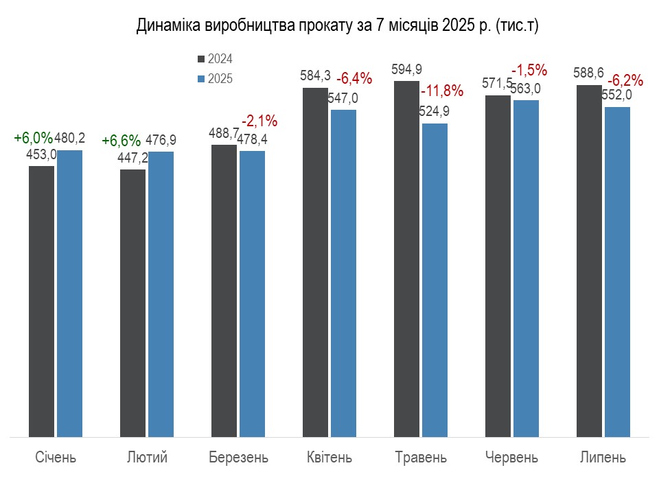Виробництво прокату за січень - липень склало 3,62 млн т, на 2,8% менше минулорічного показника. У липні 2025 року виготовлено 552,0 тис. т металовиробів, на 1,9% менше, ніж у червні.
