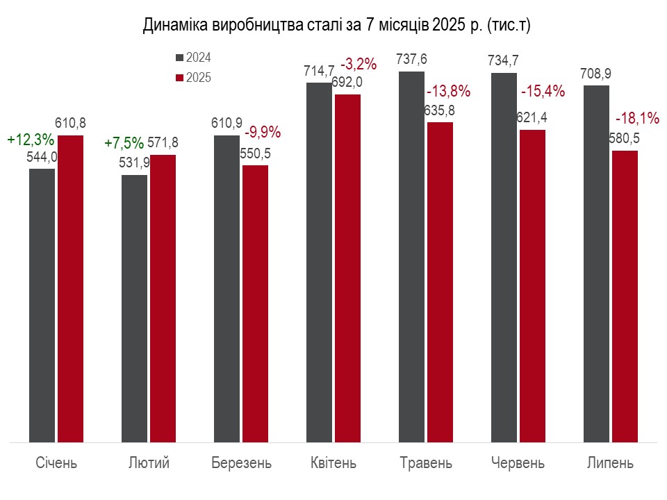Згідно з даними об'єднання, українські металургійні підприємства у січні - липні виплавили 4,26 млн т сталі, що на 7% менше, ніж за аналогічний період торік. Зокрема, у липні виплавлено 580,5 тис. т, що на 18% менше минулорічного показника і на 6% менше, ніж у червні.