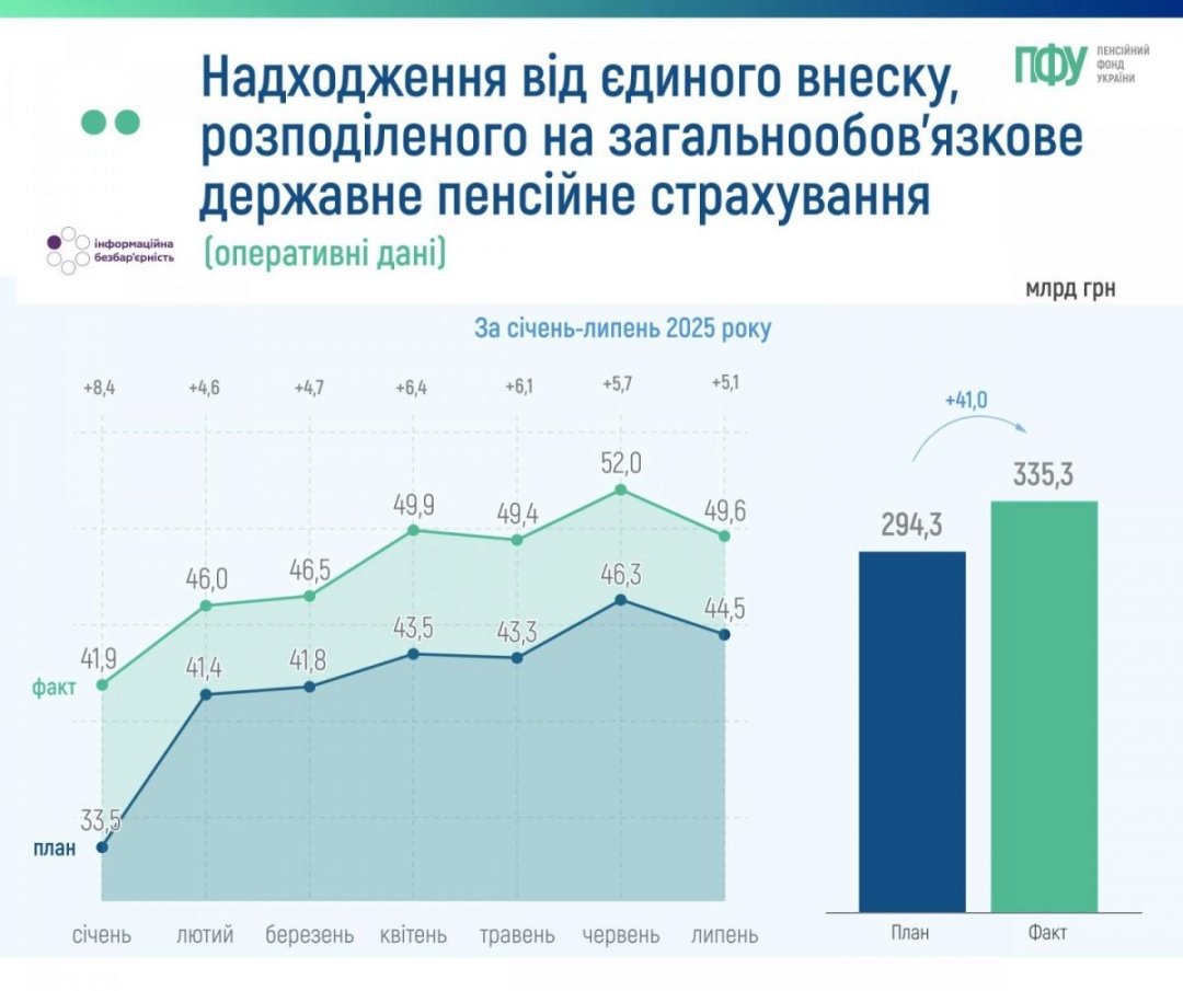 Згідно з оприлюдненими оперативними даними, у січні - липні 2025 року до бюджету Пенсійного фонду фактично надійшло 335,3 млрд грн від сплати єдиного соціального внеску, розподіленого на загальнообов'язкове державне пенсійне страхування. Зокрема, у липні - 49,6 млрд грн.