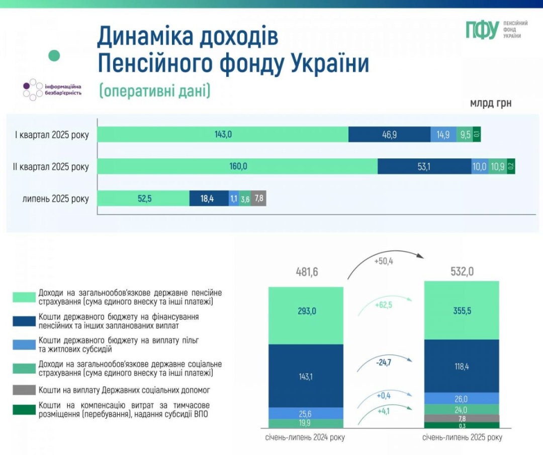 Зазначається, що власні доходи Пенсійного фонду (частина соціального внеску + інші платежі) за сім місяців становили 355,5 млрд грн, що на 62,5 млрд грн більше, ніж за аналогічний період 2024 року.