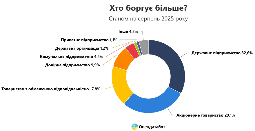 Найчастіше боржниками є державні підприємства - 33% від загальної кількості (11 562 борги), а також акціонерні товариства - 29% (10 308 боргів). Товариства з обмеженою відповідальністю складають майже 18% боржників (6 298 боргів).