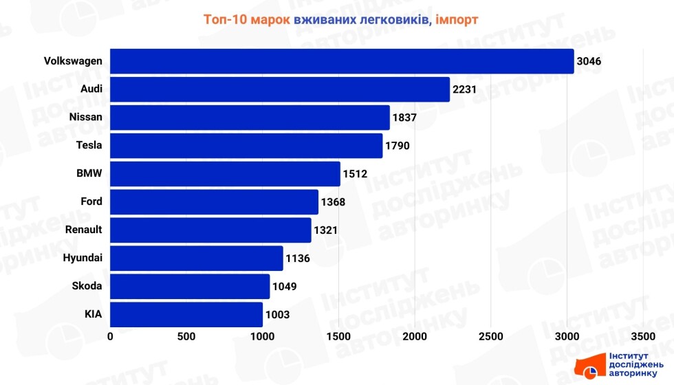 Аналітики зазначили, що лідером імпорту з помітним відривом залишається Volkswagen (3046 од.), який продовжує домінувати в сегменті вживаних авто завдяки широкому вибору моделей, доступності комплектуючих та хорошій ціні на європейських аукціонах.