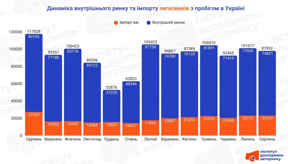 Згідно з наведеної в повідомленні діаграмою, загалом ринок вживаних легкових авто (імпорт + внутрішні перепродажі) у серпні скоротився на 16,7% до серпня-2024 - до 97,95 тис. од., з них внутрішній ринок зменшився на 17% - до 74,82 тис. од.