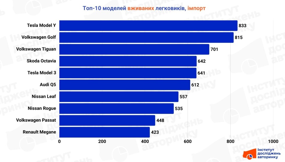 В розрізі моделей, за даними експертів, лідером стала Tesla Model Y (833 од.), а Volksvagen Golf, який тривалий час займав першу сходинку, посунувся на другу позицію (815 од.)