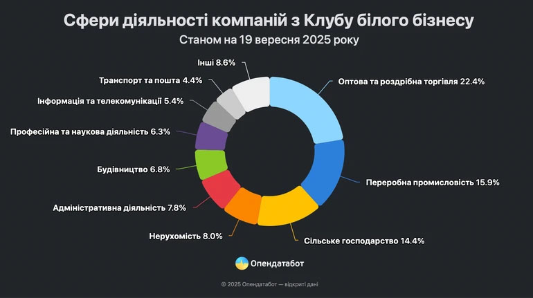 Згідно з дослідженням, найбільша концентрація "білого бізнесу" спостерігається у сфері торгівлі та ремонту автотранспорту - 1 485 компаній, що складає понад п'яту частину всього списку. Далі йдуть переробна промисловість (1 054 компанії) та аграрний сектор (952 компанії).