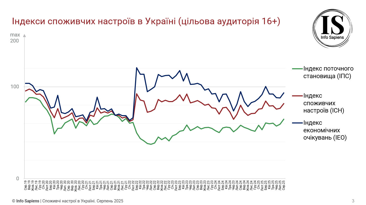 «Після кількох місяців незначного падіння, індекс споживчих настроїв показав зростання в серпні 2025 року. Аналогічна тенденція спостерігається щодо індексу поточного становища та економічних очікувань. Показники як споживчих настроїв, так і економічних очікувань наближені до значень, які ми спостерігали в аналогічний період 2023-го року, але поточне становище цього року оцінено дещо краще.» - коментують аналітики Info Sapiens.