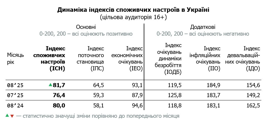 За даними дослідження Info Sapiens «Споживчі настрої в Україні» у серпні 2025 року Індекс споживчих настроїв українців зріс на 5,2 пункти та становить 81,7 п. Зросли усі складові індикатора.