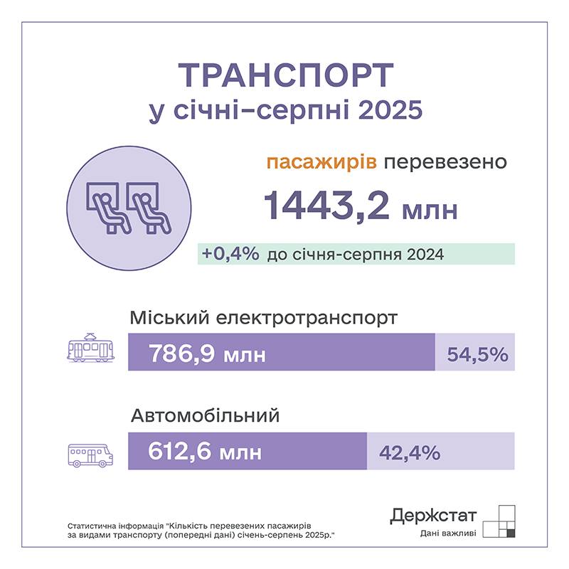 Водночас за вісім місяців поточного року зростання демонструють пасажирські перевезення. Загалом за цей період пасажирським транспортом скористалися 1 443,2 млн осіб, що 0,4% більше за показник минулого року.