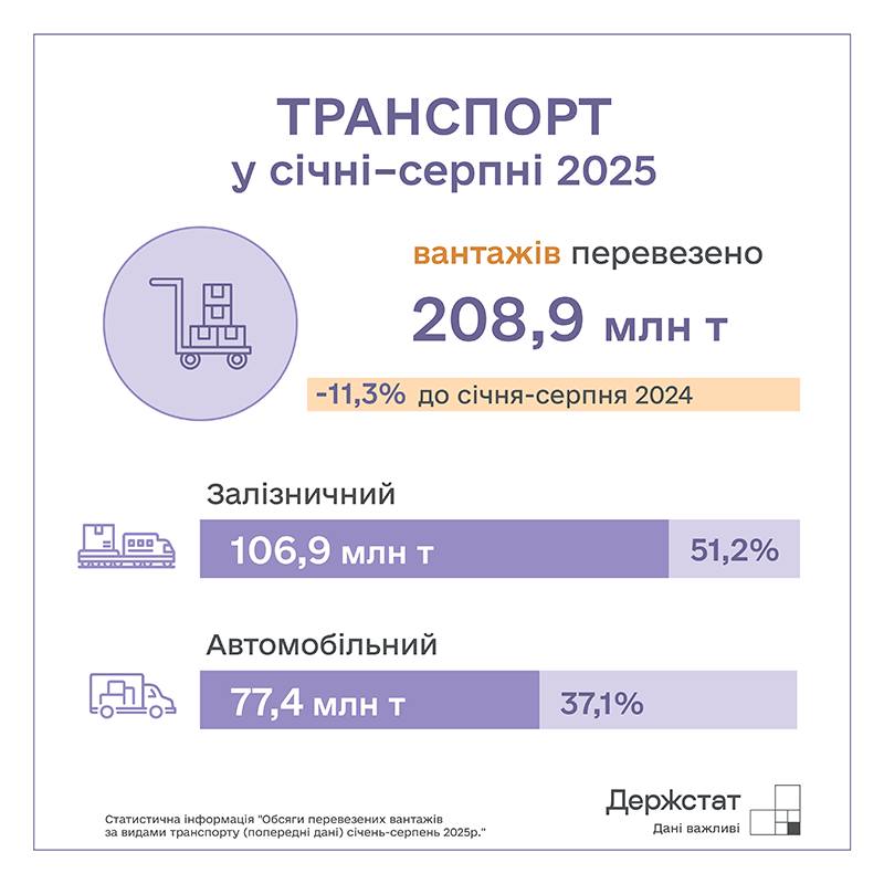 «У січні-серпні 2025 року перевезено 208,9 млн тонн вантажів, що на 11,3% менше, ніж торік. Основні обсяги перевезено: 106,9 млн тонн - залізничним транспортом, 77,4 млн тонн - автомобільним», - йдеться в повідомленні.
