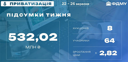 Фонд державного майна України 22 - 26 вересня 2025 року провів вісім приватизаційних аукціонів, на яких залучив 532,02 млн гривень.