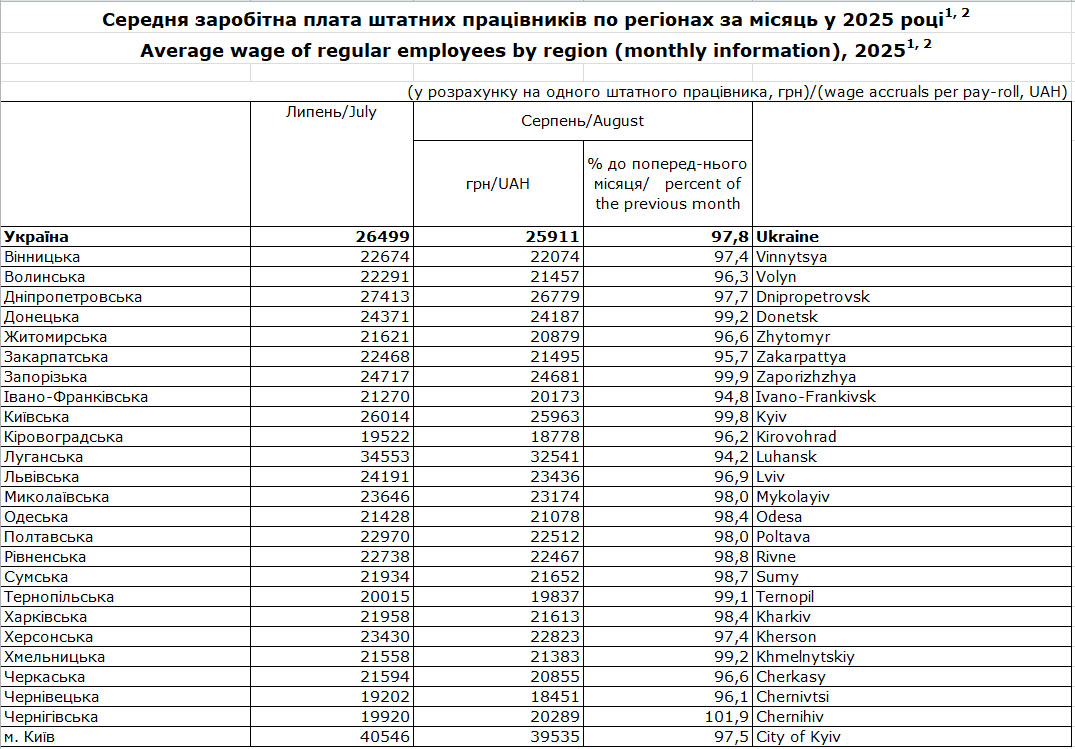 Згідно з оприлюдненими даними, у серпні 2025 року розмір середньої заробітної плати в Україні склав 25 911 грн проти 26 499 грн місяцем раніше.