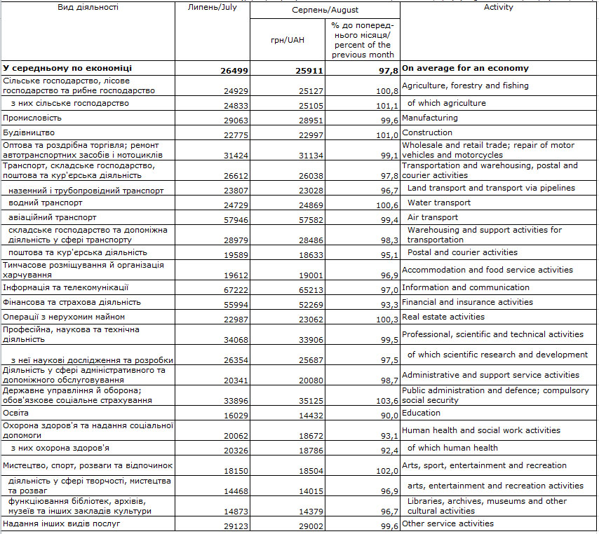 У серпні в Україні показник середньої заробітної плати штатних працівників становив 25 911 грн, що на 2,2% менше, ніж у липні.