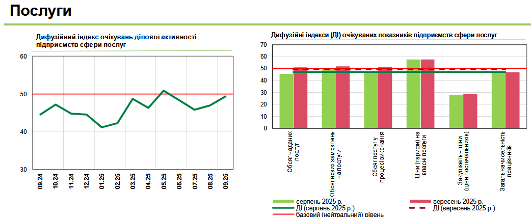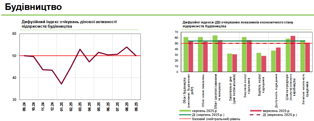 Підприємства будівництва не очікували змін у своїй поточній діяльності, попри фінансування будівництва доріг, сталий внутрішній попит, а також сприятливі погодні умови: секторальний індекс у вересні становив 50.0 порівняно з 54.0 у серпні 2025 року (у вересні 2024 року - 50.1). Будівельники очікували на подальше збільшення обсягів будівництва, нових замовлень та закупівлі сировини й матеріалів, хоча й повільнішими темпами. На тлі очікуваного зростання вартості послуг підрядників респонденти були налаштовані на сповільнення темпів збільшення обсягу закупівлі їхніх послуг. Тривало пом'якшення оцінок щодо доступності підрядників.
