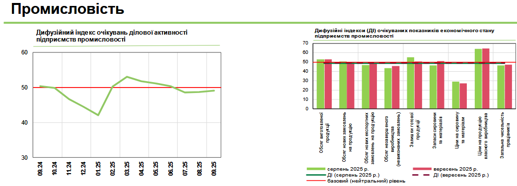Підприємства промисловості пом'якшили стримані оцінки результатів своєї діяльності, незважаючи на подальше руйнування виробничих потужностей та подолання їх наслідків, а також брак кваліфікованих працівників: секторальний індекс у вересні становив 49.1 порівняно з 48.7 у серпні 2025 року (у вересні 2024 року - 50.3). Промисловці й надалі були налаштовані на збільшення обсягу виготовленої продукції, натомість не очікували змін щодо обсягу нових замовлень на продукцію. Водночас пом'якшилися стримані оцінки щодо обсягу нових експортних замовлень на продукцію, обсягу незавершеного виробництва, а також залишків готової продукції. Уперше за шість місяців очікувалося збільшення обсягу запасів сировини та матеріалів.