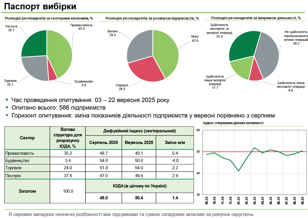 Про це свідчить індекс очікувань ділової активності (ІОДА), який Національний банк розраховує щомісяця, за винятком вимушеної перерви в березні - травні 2022 року. У вересні 2025 року ІОДА зріс до 50.4 з 49.0 у серпні 2025 року та був вищий за рівень у вересні 2024 року (48.7).