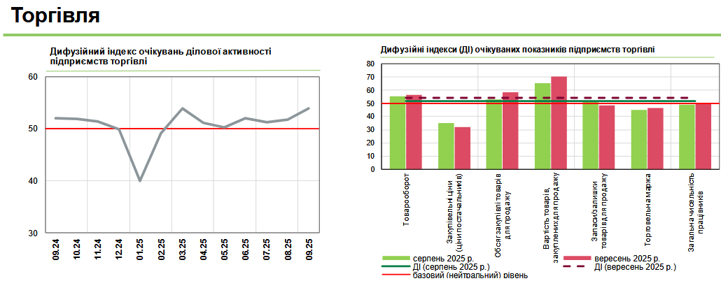 Підприємства торгівлі сьомий місяць поспіль позитивно оцінили свої поточні економічні результати та були найоптимістичнішими серед респондентів завдяки достатній пропозицій товарів, жвавому попиту та сповільненню інфляції: секторальний індекс у вересні зріс до 54.0 з 51.8 у серпні 2025 року (у вересні 2024 року - 52.1). Торговельні компанії й надалі очікували на збільшення обсягу товарообороту та обсягу закупівлі товарів для продажу, а також позитивно оцінили запаси / залишки товарів для продажу. Респонденти, як і раніше, очікували на зниження торговельної маржі.