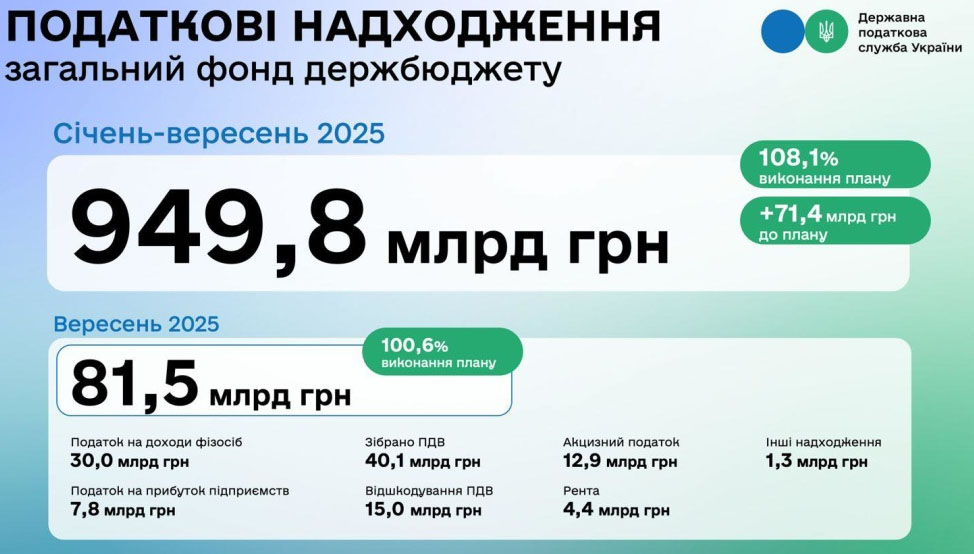 За січень - вересень цього року до загального фонду державного бюджету надійшло 949,8 млрд грн податкових платежів, що на 24,6% більше, ніж за аналогічний період торік.