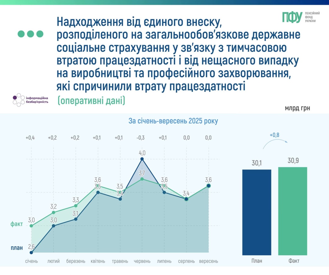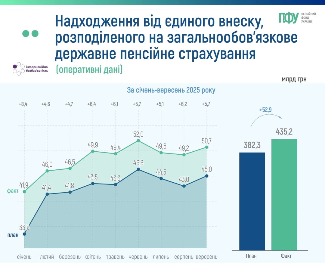 Згідно з оприлюдненими ПФУ оперативними даними, у січні - вересні 2025 року до бюджету Пенсійного фонду фактично надійшло 435,2 млрд грн від сплати єдиного внеску, розподіленого на загальнообов'язкове державне пенсійне страхування. Зокрема, у вересні - 50,7 млрд грн.