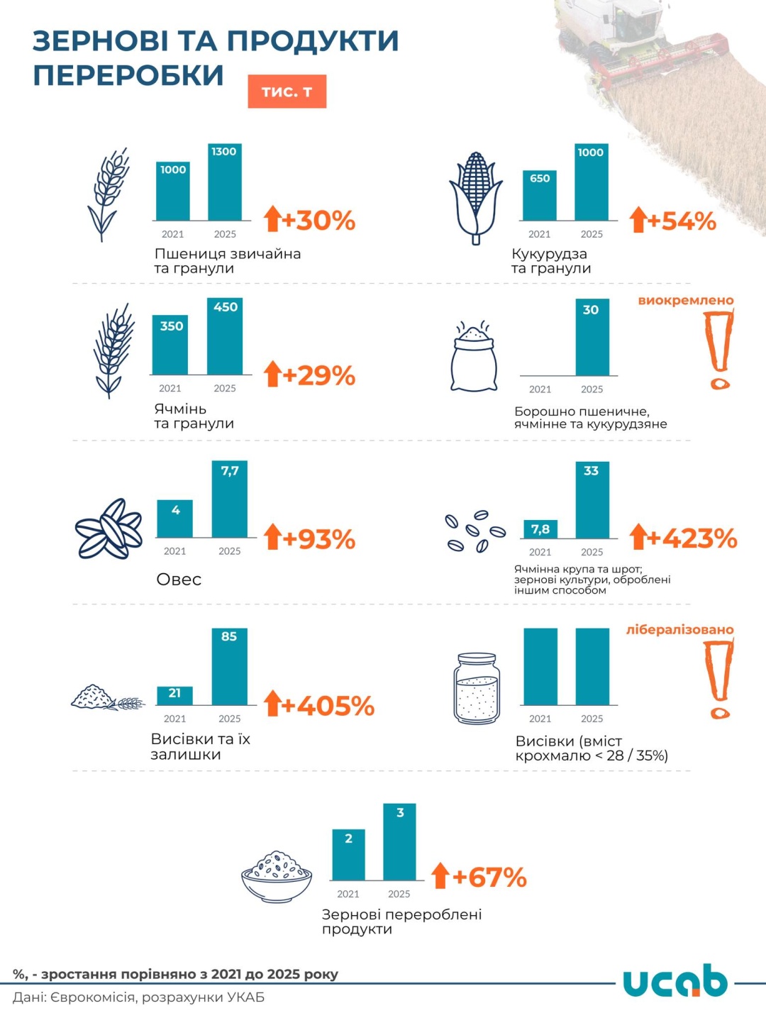 Крім того, зросли квоти на перероблену продукцію. Зокрема, квота на висівки та їх залишки збільшилася на 405% (з 21 тис. до 85 тис. т), а на ячмінну крупу та шрот - на 423% (з 7 800 до 33 200 т).