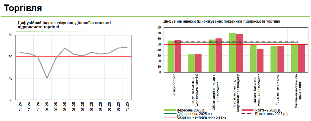 Підприємства торгівлі восьмий місяць поспіль позитивно оцінили свої поточні економічні результати та вдруге поспіль були найоптимістичнішими серед респондентів завдяки надходженню достатньої пропозиції товарів від нового врожаю, жвавому споживчому попиту і сповільненню інфляції: секторальний індекс у жовтні зріс до 54.3 з 54.0 у вересні 2025 року (у жовтні 2024 року - 51.9). Торговельні компанії й надалі очікували на збільшення обсягу товарообороту та обсягу закупівлі товарів для продажу, а також поліпшили оцінки запасів / залишків товарів для продажу. Респонденти, як і раніше, очікували на зниження торговельної маржі, хоча й нижчими темпами.