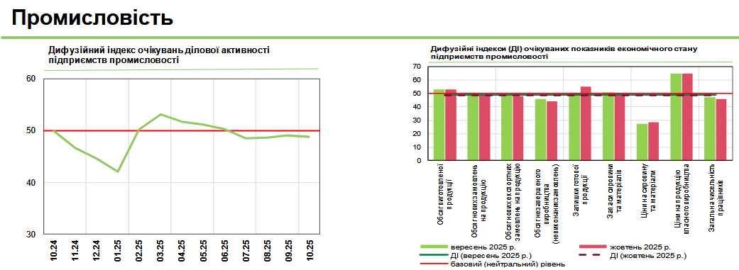 Підприємства промисловості надали стриманіші оцінки результатів своєї діяльності, зважаючи на подальше руйнування виробничих потужностей, високі витрати на відновлення, оплату праці й енергоресурси, а також енергодефіцит: секторальний індекс у жовтні становив 48.8 порівняно з 49.1 у вересні 2025 року (у жовтні 2024 року - 49.8). На відміну від минулого місяця промисловці були налаштовані на зменшення обсягів нових замовлень на продукцію, а також запасів сировини та матеріалів. Очікувалося подальше зменшення обсягів нових експортних замовлень, незавершеного виробництва та залишків готової продукції. Водночас респонденти зберегли позитивні очікування щодо збільшення обсягу виготовленої продукції.