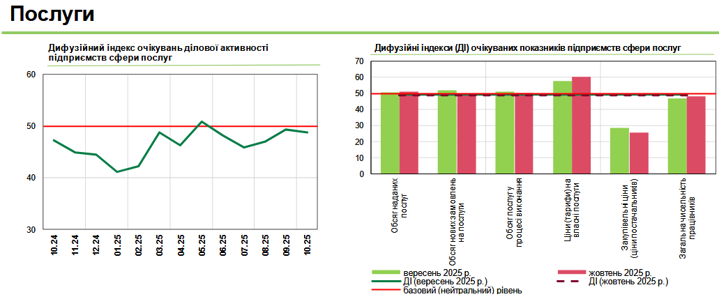 Підприємства сфери послуг також стриманіше оцінили свої економічні перспективи з огляду на руйнування залізничної інфраструктури, ускладнення та здорожчання логістики, збереження дефіциту кваліфікованих кадрів: секторальний індекс у жовтні становив 48.7 (у вересні 2025 року - 49.4, у жовтні 2024 року - 47.2). На відміну від попереднього місяця респонденти очікували на зменшення обсягу нових замовлень на послуги. Водночас збереглися позитивні очікування щодо обсягу наданих послуг та послуг у процесі виконання.