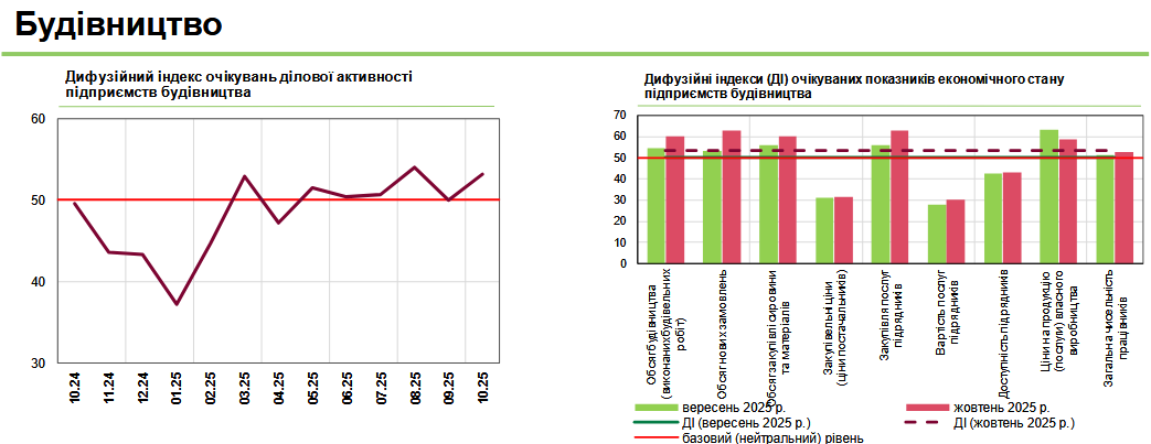 Підприємства будівництва також поліпшили оцінки результатів своєї поточної діяльності, зважаючи на бюджетне фінансування на відновлення інфраструктури та будівництво доріг, пожвавлення житлового будівництва, а також сезонний чинник: секторальний індекс у жовтні зріс до 53.3 з 50.0 у вересні 2025 року (у жовтні 2024 року - 49.6). Будівельники впевненіше очікували на збільшення обсягів будівництва, нових замовлень та закупівлі сировини й матеріалів. На тлі очікуваного сповільнення зростання вартості послуг підрядників респонденти були налаштовані на пришвидшення темпів збільшення обсягу закупівлі їхніх послуг. Тривало пом'якшення стриманих оцінок щодо доступності підрядників.