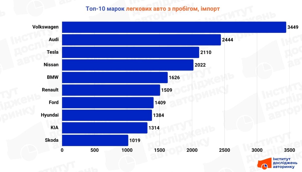 Відомо, що на внутрішньому ринку давно править Volkswagen, однак не лише там - серед новоприбулих з-за кордону він теж на першому місці: 3 449 авто. Далі - Audi (2 444), Tesla (2 110), Nissan (2 022), BMW (1 626). Це вже давно сформоване електро‑преміум ядро українського імпорту.