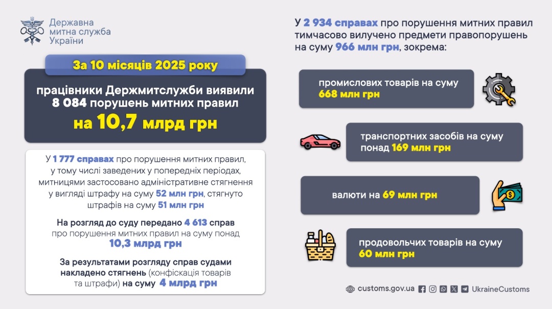 Державна митна служба України у січні - жовтні 2025 року виявила 8 084 порушення митних правил на 10,7 млрд грн.