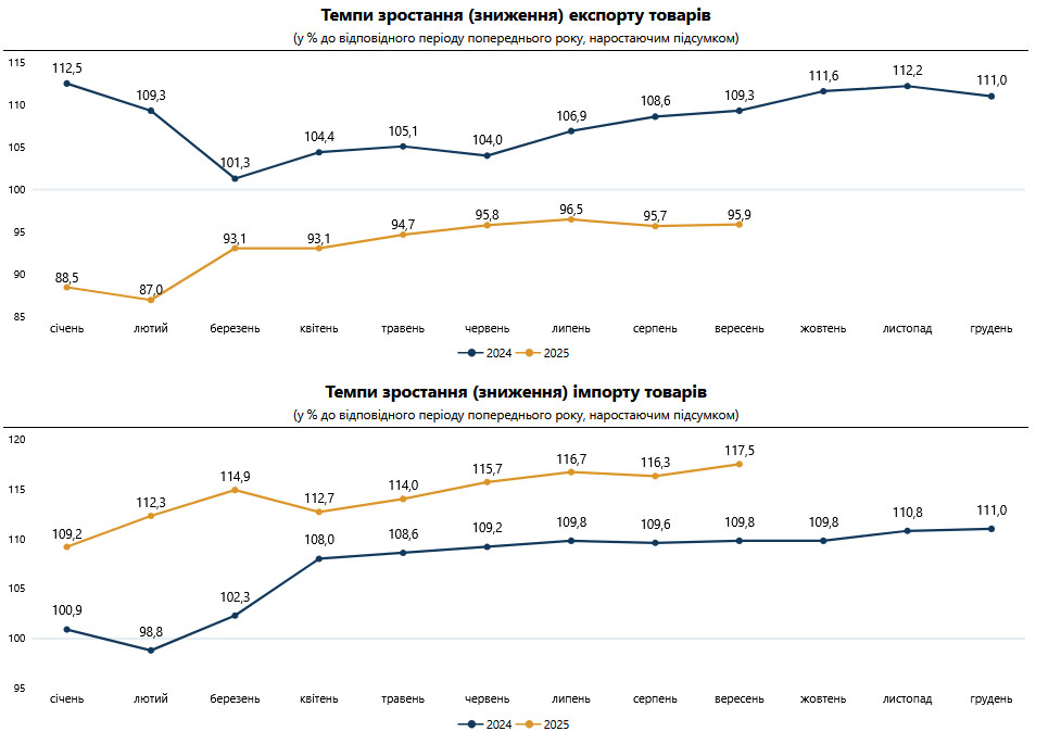 «За 9 місяців 2025 року експорт товарів становив 29 572,1 млн дол. США, або 95,9% порівняно із 9 місяцями 2024 року, імпорт - 60 191,0 млн дол., або 117,5%», - йдеться в повідмоленні.