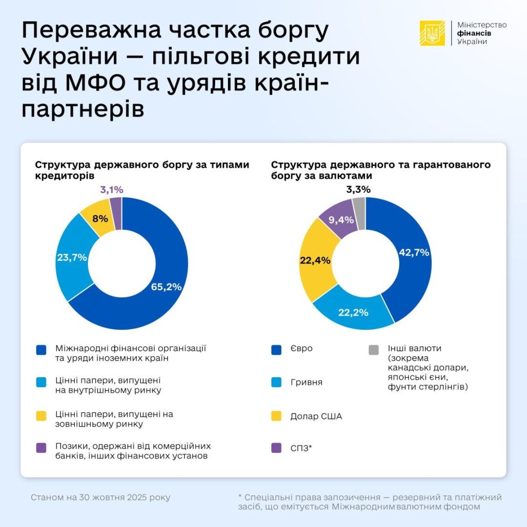 Зазначається, що станом на 31 жовтня 2025 року державний зовнішній борг становив 6 090,87 млрд грн (73,6%), або 145,12 млрд дол. США; державний внутрішній борг - 1 899,14 млрд грн (22,9%), або 45,25 млрд дол. США та гарантований державою борг - 286,2 млрд грн (3,4%), або 6,8 млрд дол. США.