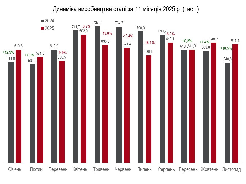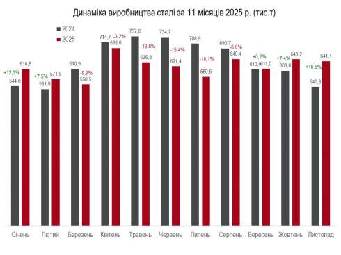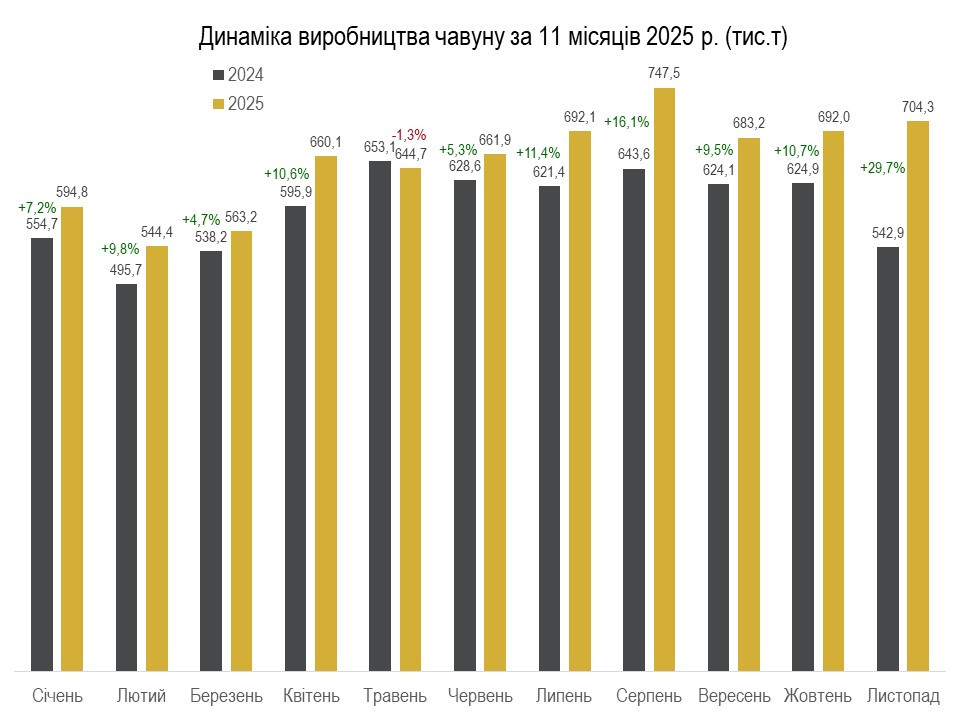 Згідно з даними об'єднання, українські металургійні підприємства за 11 місяців виплавили 6,52 млн т чавуну, що на 10,2% більше, ніж за аналогічний період торік. Зокрема, у листопаді виплавлено 704,3 тис. т, що на 1,8% більше, ніж у жовтні. Порівняно із листопадом 2024 року зафіксовано зростання на 29,7%.