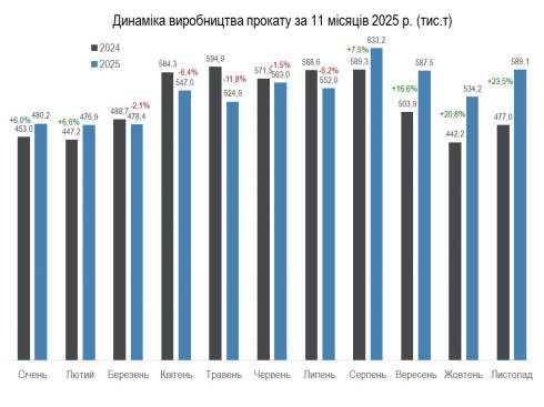 У виробництві прокату за звітний період зафіксовано зростання обсягів на 3,9% - до 5,74 млн т. При цьому порівняно з жовтнем 2025-го виробництво прокату збільшилося на 10,3%%, у річному вимірі - на 23,5%.