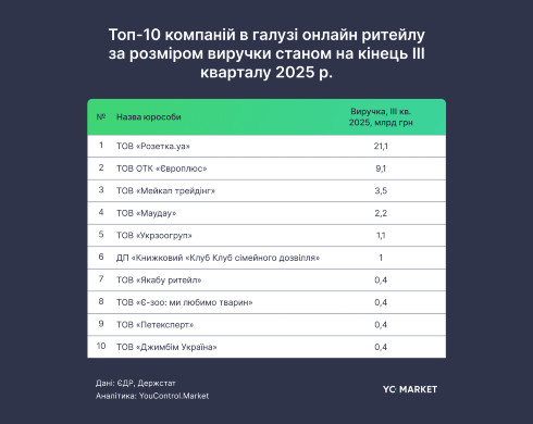 ТОП‑10 онлайн‑ритейлерів за 9 місяців 2025 року заробили майже 40 млрд грн, із яких 30,2 млрд грн виторгу (76%) припадає на дві компанії, що входять до групи Rozetka.