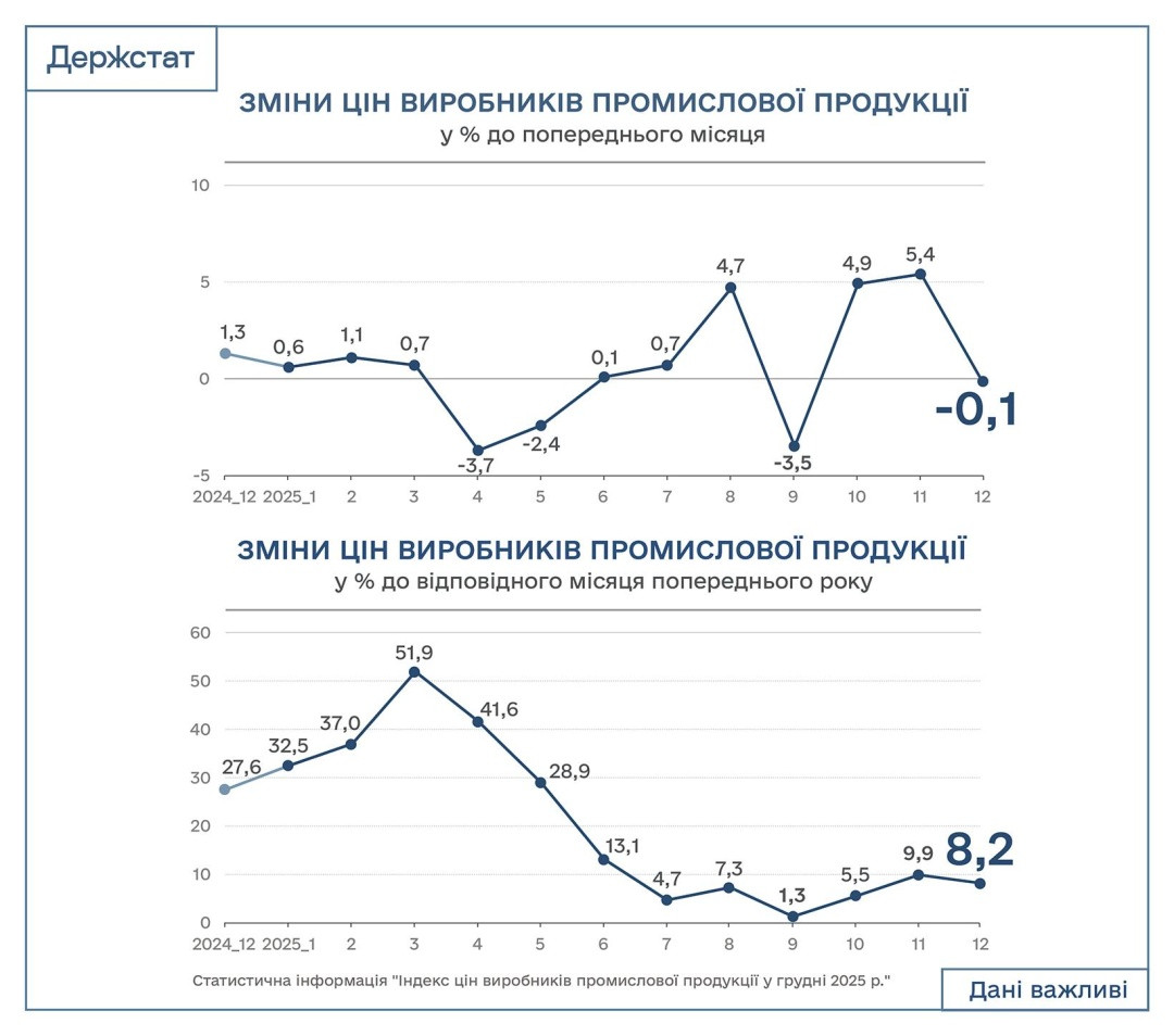 За даними Держстату, у грудні 2025 року індекс цін виробників (показник середнього рівня зміни відпускних оптових цін на сировину, матеріали та товари проміжного споживання) порівняно з листопадом зменшився на 0,1%. Зокрема падіння цін було зафіксовано у сфері постачання електроенергії, газу, пари та кондиційованого повітря (-0,8%), у добувній промисловості та розробленні кар'єрів (-0,1%). Водночас на 0,5% зросли ціни у сфері переробної промисловості.