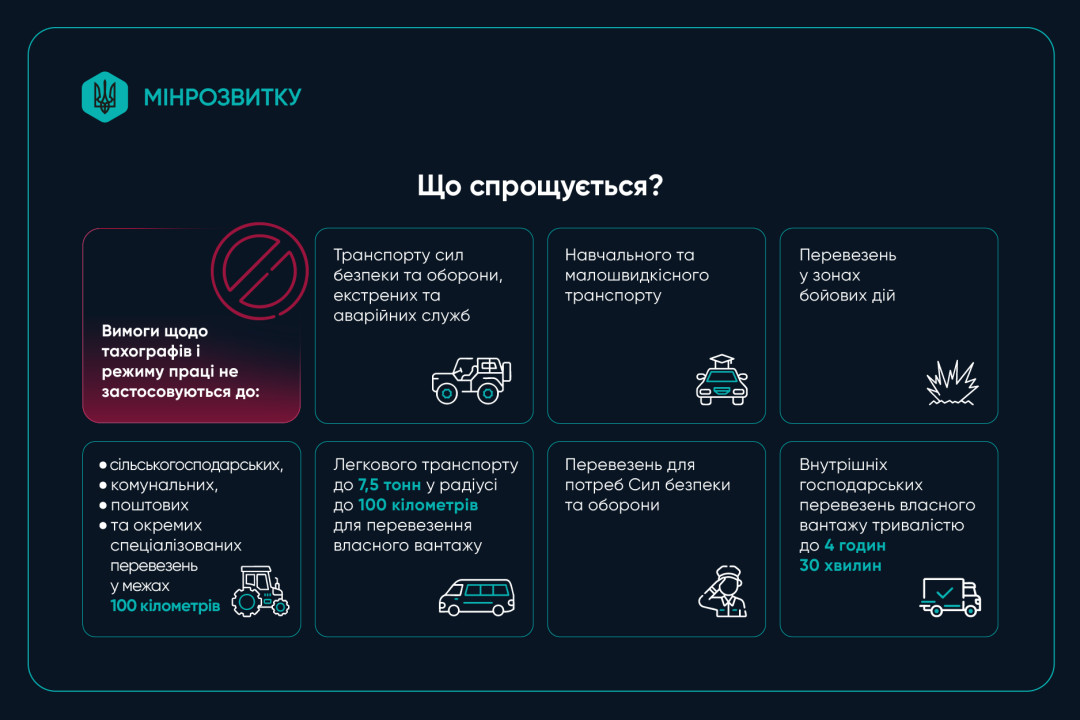 Також спрощені умови для навчального та малошвидкісного транспорту, перевезень у зонах бойових дій, для потреб Сил безпеки та оборони та для внутрішніх господарських перевезень власного вантажу тривалістю до 4 годин 30 хвилин.