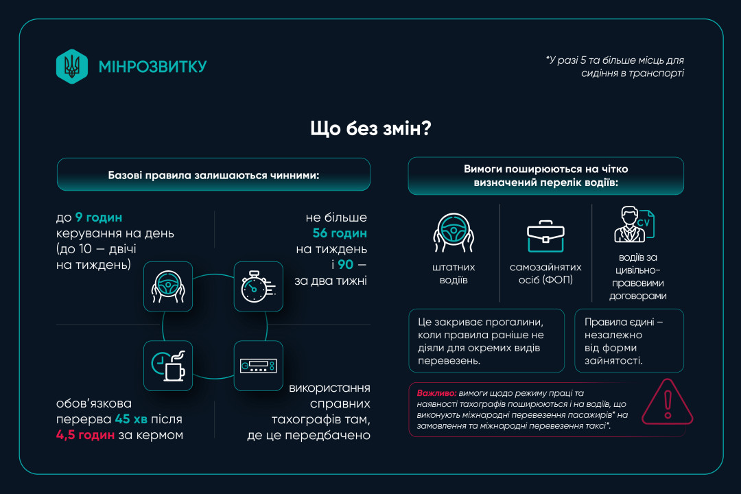 «Наказом № 1727 затверджено нову редакцію Положення про робочий час і час відпочинку водіїв колісних транспортних засобів. Наказ вже зареєстрований Міністерством юстиції та офіційно опубліковано. Документ впроваджує ключові норми ЄС, зокрема положення Регламенту (ЄС) №561/2006, Директиви 2002/15/ЄС, а також рішення Спільного комітету Україна-ЄС щодо застосування стандартів смарт-тахографів (G2V2)», - йдеться в повідомленні.